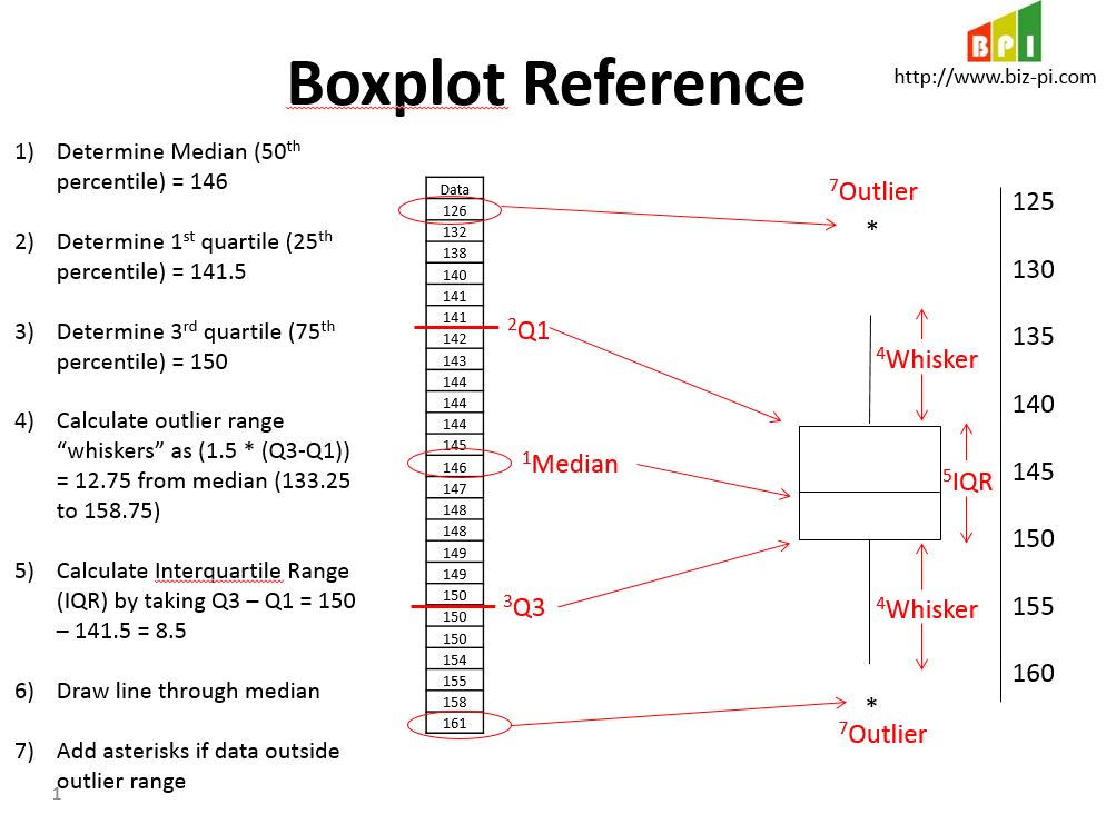 Next, we need to calculate the Interquartile Range (IQR), which defines the “whiskers” around the box. The whiskers extend 50% beyond the width of the box (1.5 x (Q3-Q1)) from the median on each side.