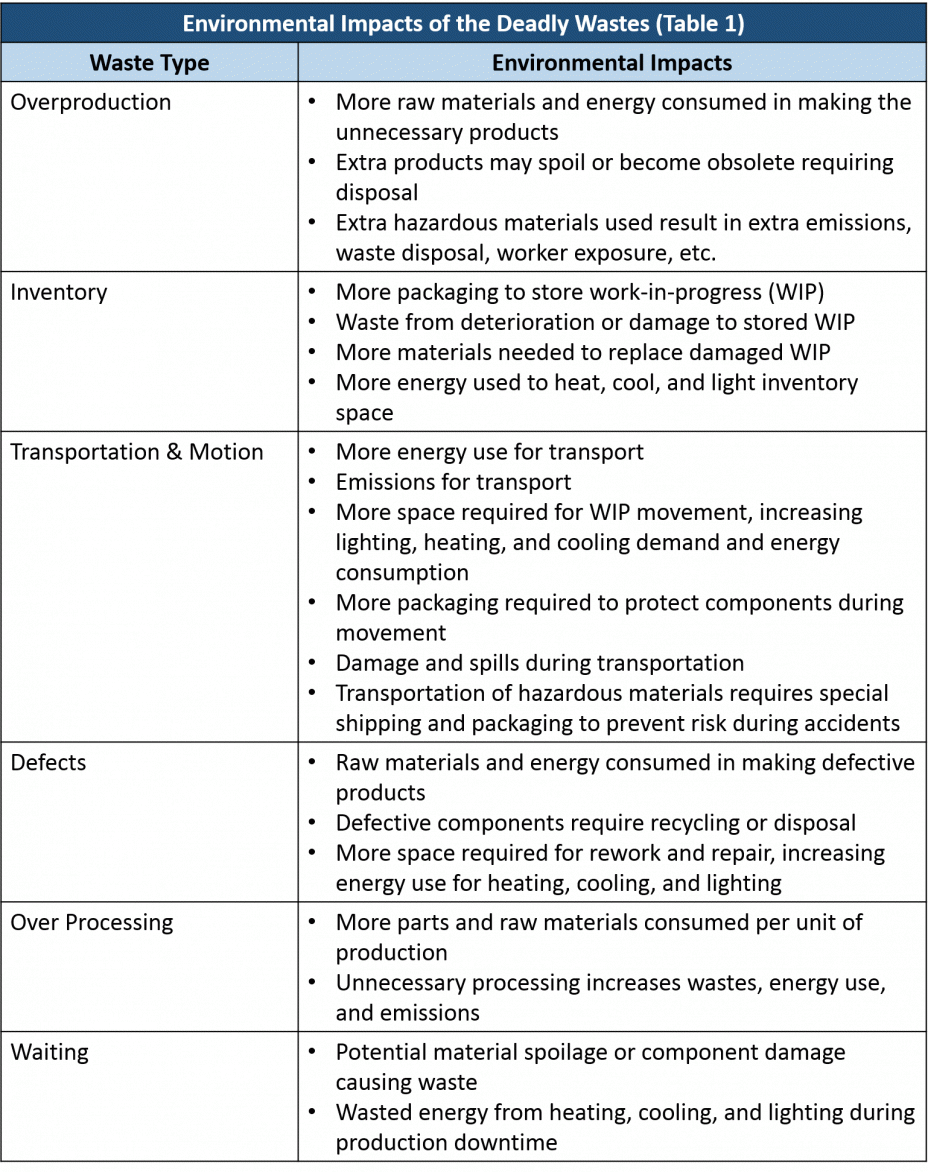 Defects and overproduction can lead to items needing to be disposed of. Inventory requires extra floor space, lighting, heating and cooling. Waiting pushes out the work, requiring overtime and more energy to keep the lights on. Transportation requires fuel and extra packaging. If you’d like to learn more about the environmental impact of these wastes, check out the EPA Lean and the Environment toolkit >>>